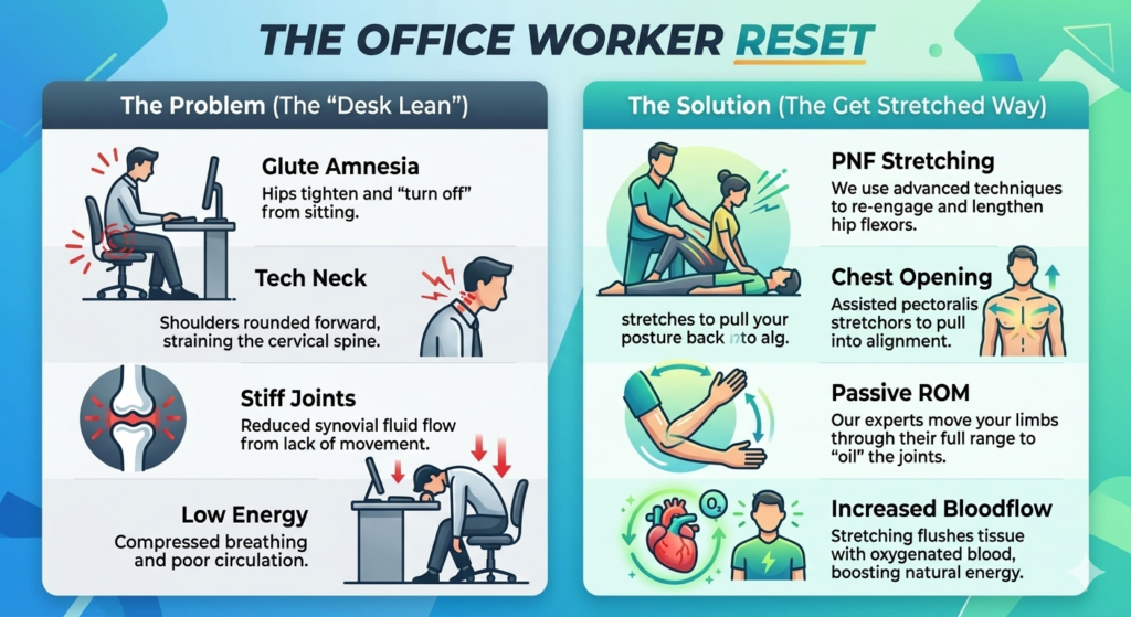 But you don’t have to just “live with it.” At Get Stretched, we specialize in reversing the “Office Body” through professional Assisted Stretching.